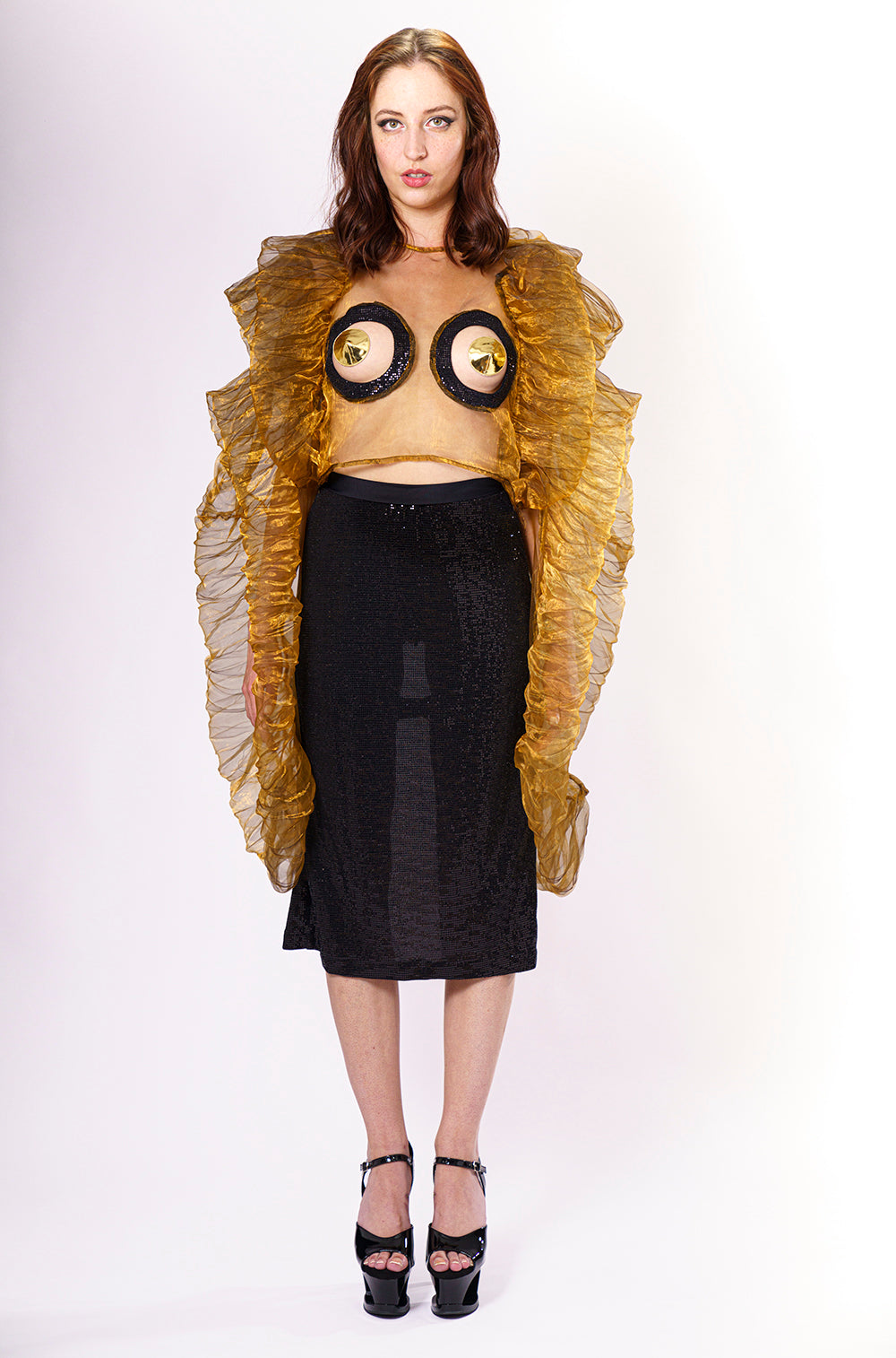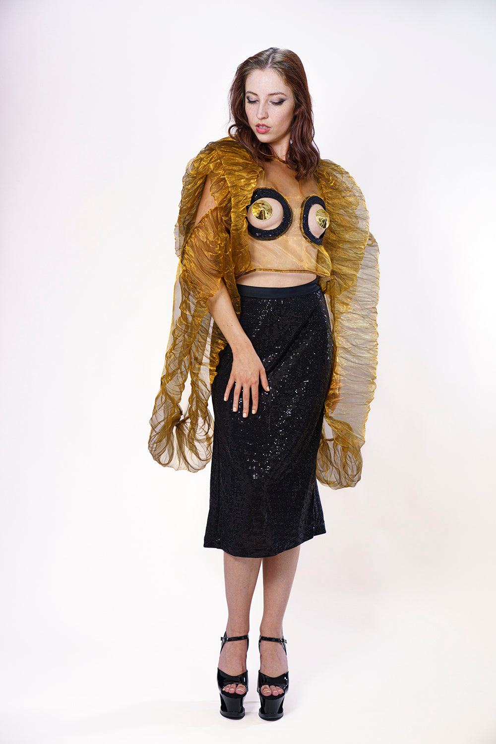 Das Tief schillernde Couture – Crop top ist ein wahres Designer Stück. Durch Hitzeverformung entstehen die ausladende Formen, die an die fallenden Blütenstränge des Goldregenserinnern sollen. Genau so ist dieses top: verführerisch und verhängnisvoll. Die kreisrunden Ausschnitte in Brustbereich legen das Innere der Blüte frei. Das Designer top ist einen langen Designprozess entsprungen. Die Blüte soll für besondere Anlässe blühen.