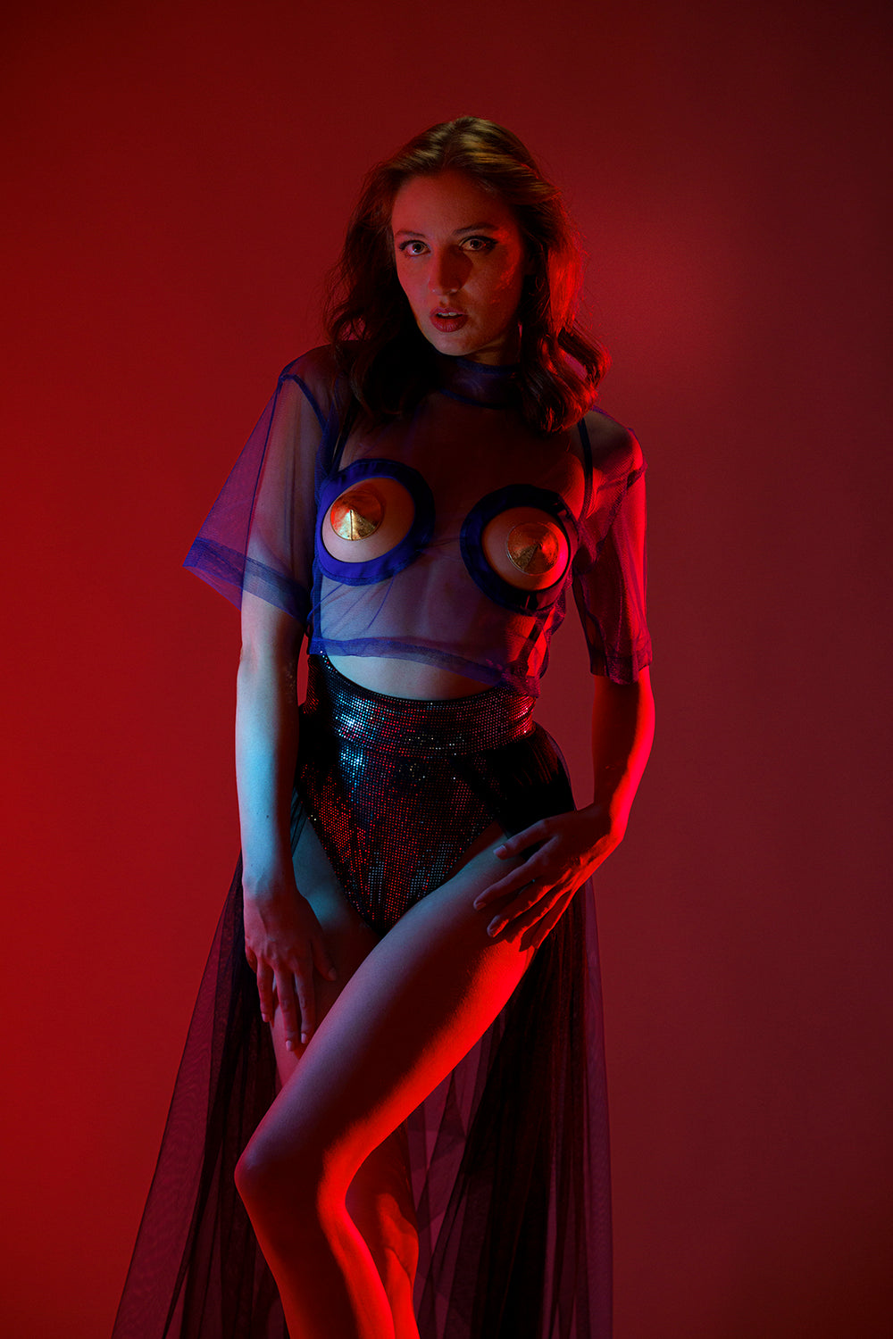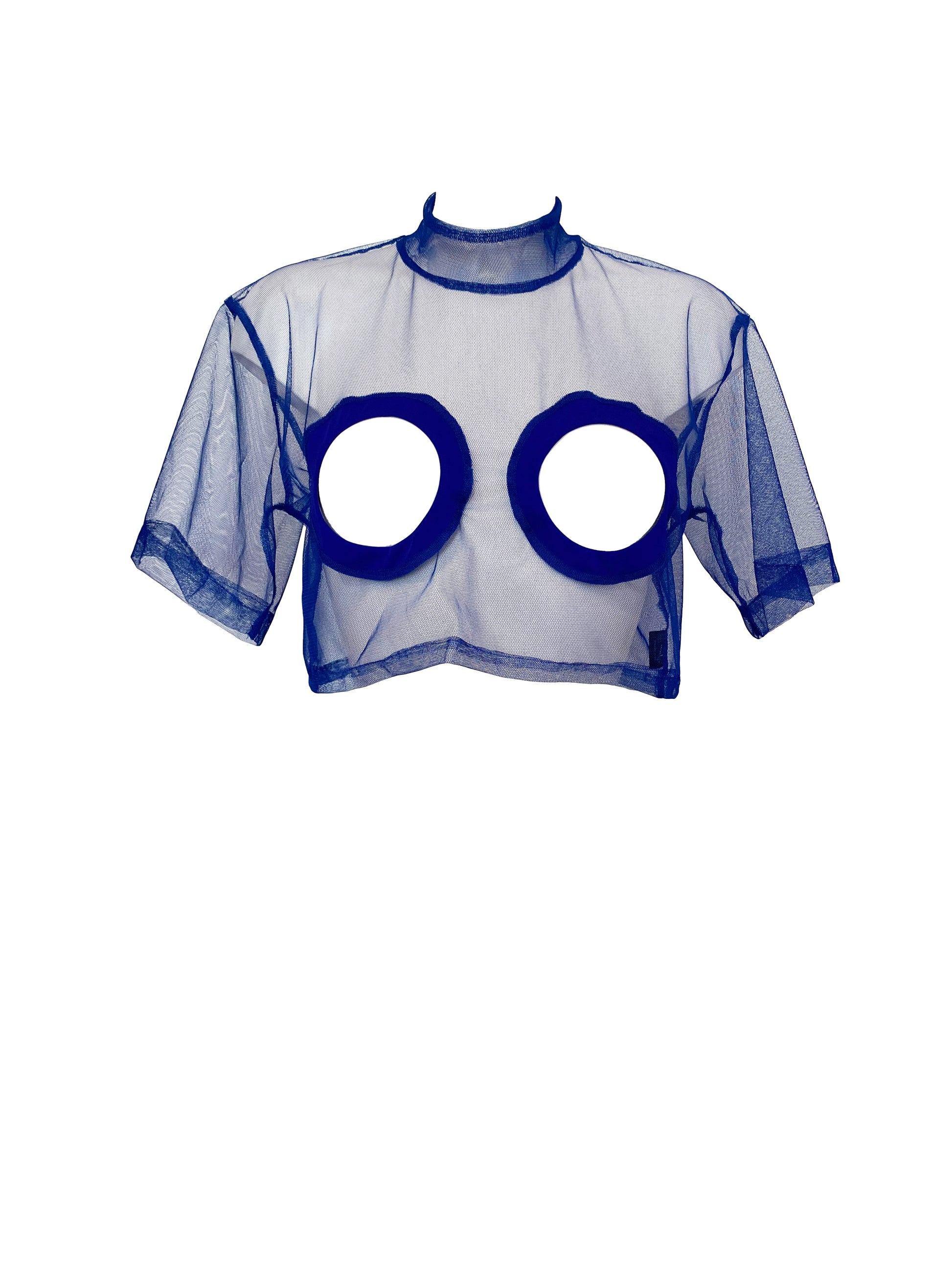 •Das ausgeschnittene Crop-Top aus feinem Tüll besticht durch seine transparente Eleganz. gleichzeitig ist es cool durch den einfachen T-Shirt Schnitt, der sehr sportlich wirkt. Ein kleiner Stehkragen rundet das Design ab. Im Brustbereich gibt es zwei kreisrunde Ausschnitte. Das Top kAnn sehr gut kombiniert werden mit Röcken, Unterwäsche, Kleider, Hosen, BHS und es ist in vielen Farben erhältlich.