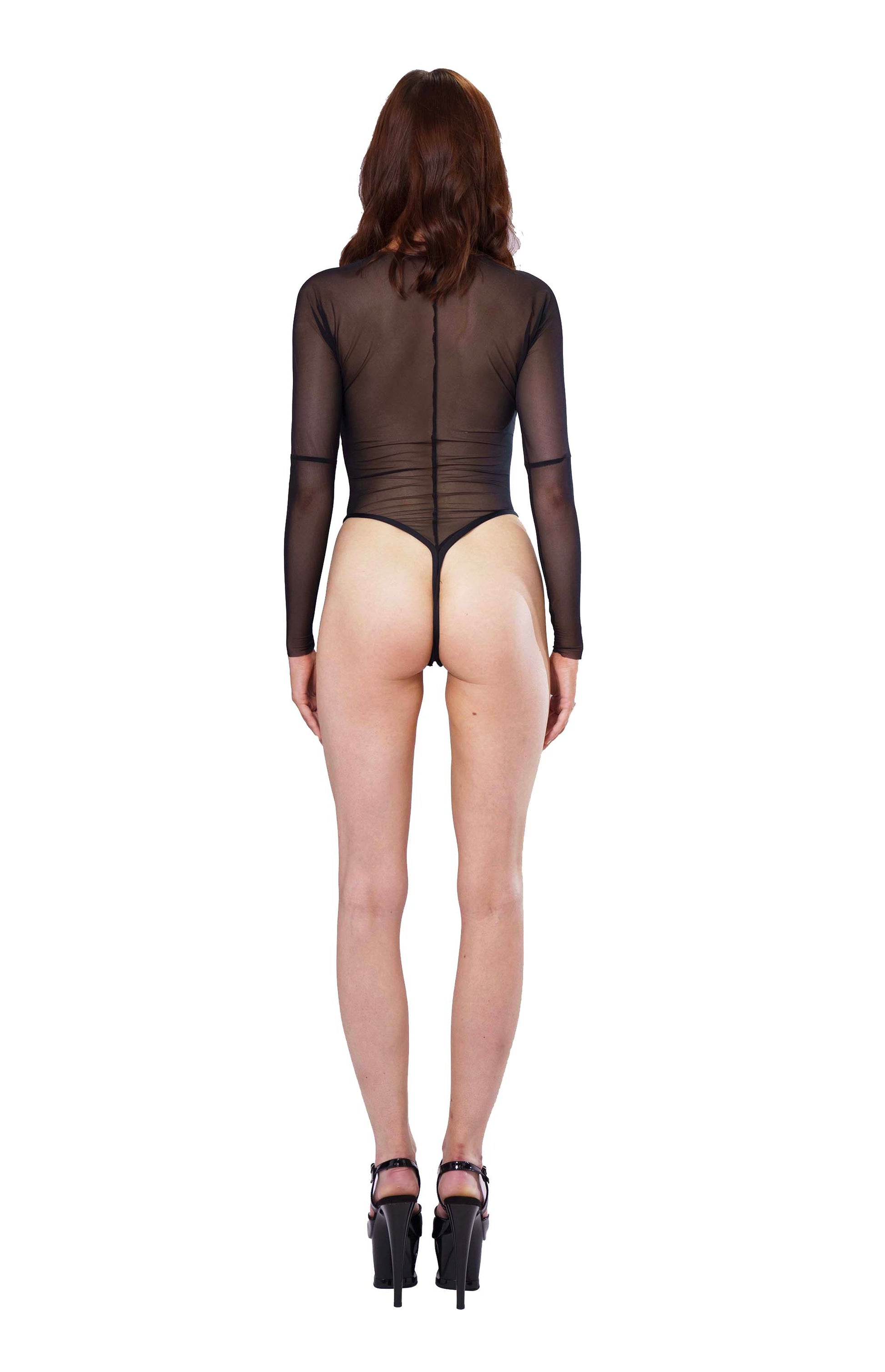 Diese Langarm Body Tanga ist aus einem sehr festen Powermesh gefertigt, der aus dem Sportbereich stammt. An der Schulter wurden so wenig Nähte wie möglich benutzt, sodass eine gleichmäßige Fläche erzielt werden konnte. Angezogen wird der Body durch den Halsausschnitt, der sehr dehnbar ist. Im Brustbereich hat der Body kreisrunde Cut-Outs aus silberfarbenem Glitzermaterial.
